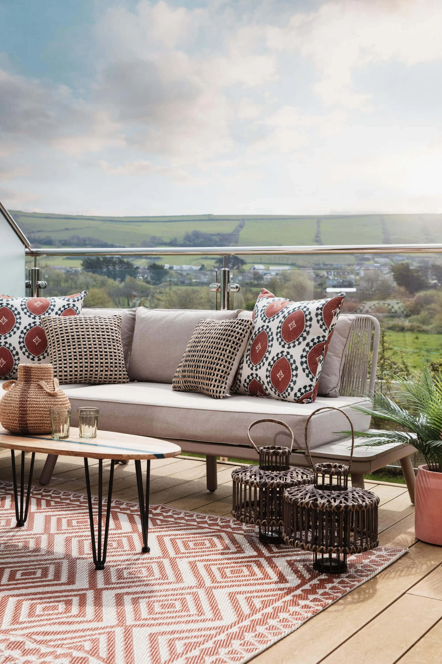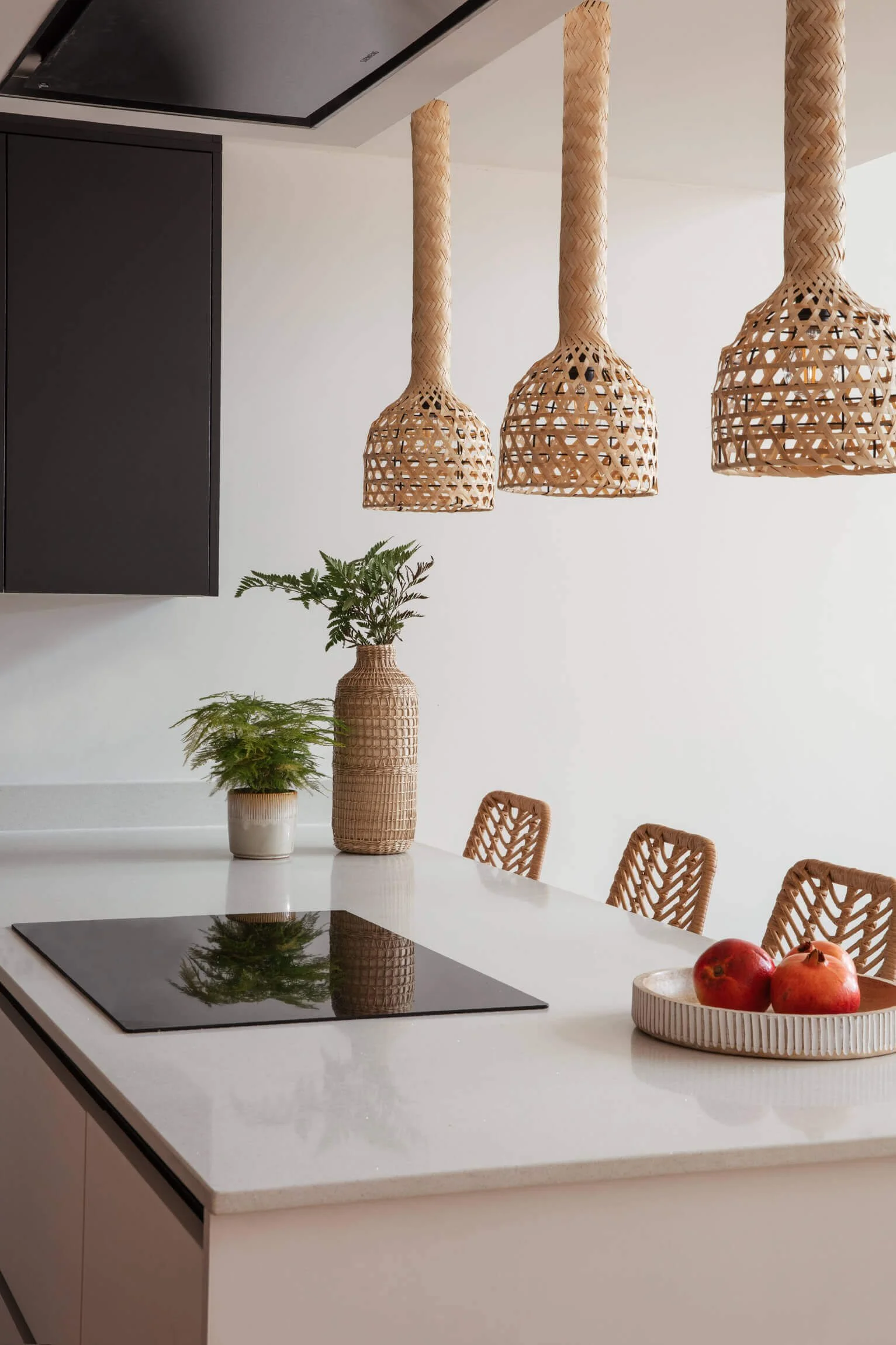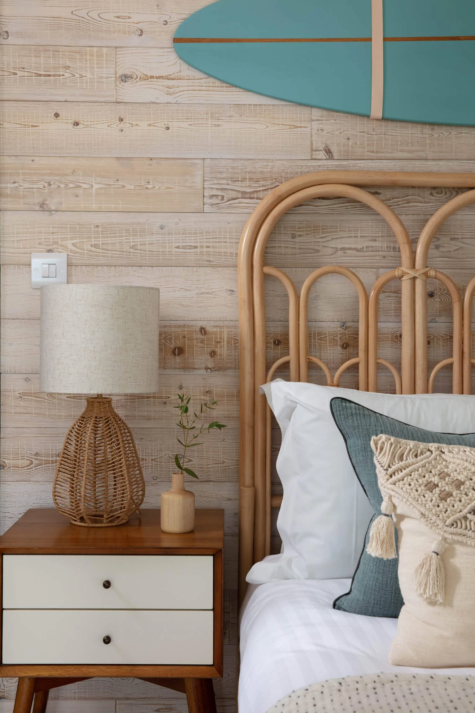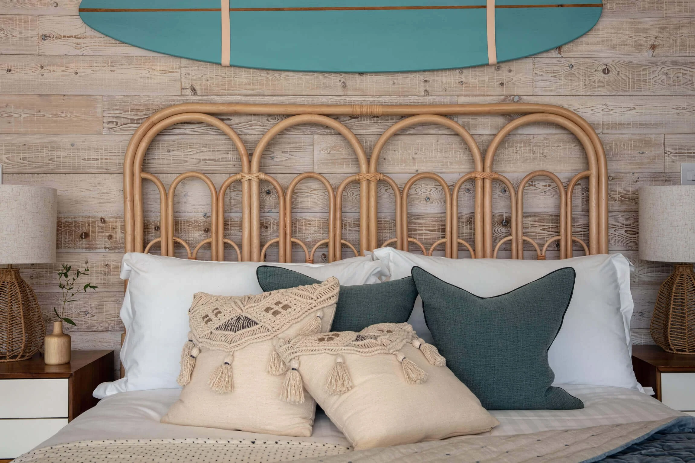 Famous for its surf, Croyde Bay inspired a boho-chic theme that incorporated ocean and earth colours and texture throughout. Unique macramé projects created by the owner were interspersed with rattan and wood to achieve an elegant beach shack feel, and bespoke 3D cork walls adorned several of the walls. The attention to detail was important, with accessories and furniture carefully chosen to create a point of difference from other beachside rentals. We intentionally kept the kitchen minimalist, but added a Bert & May geometric tiled splashback to tie in with the furnishings in the open plan living space, and hung statement wicker lampshades, chosen not only for their aesthetic but also for the unique shadow detail they created.
