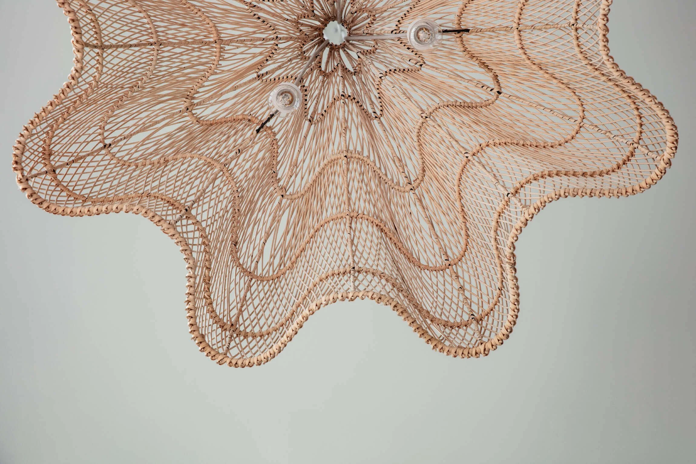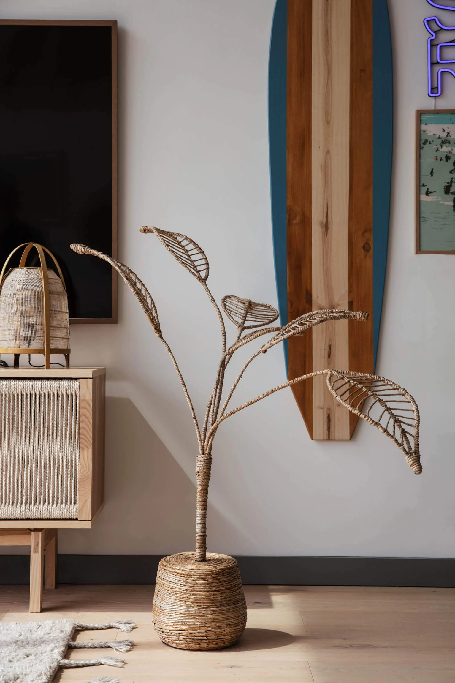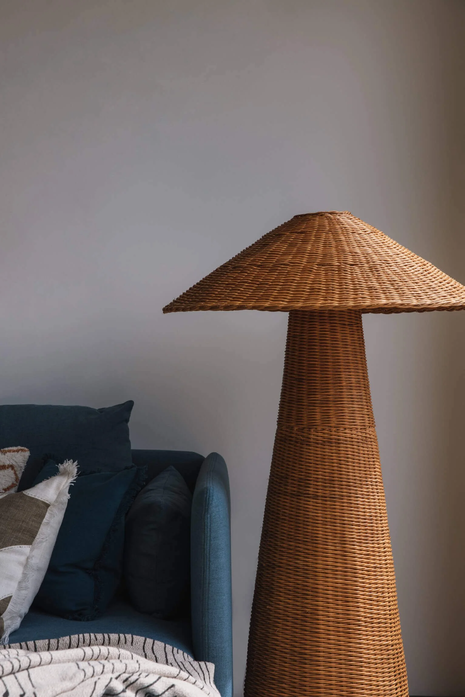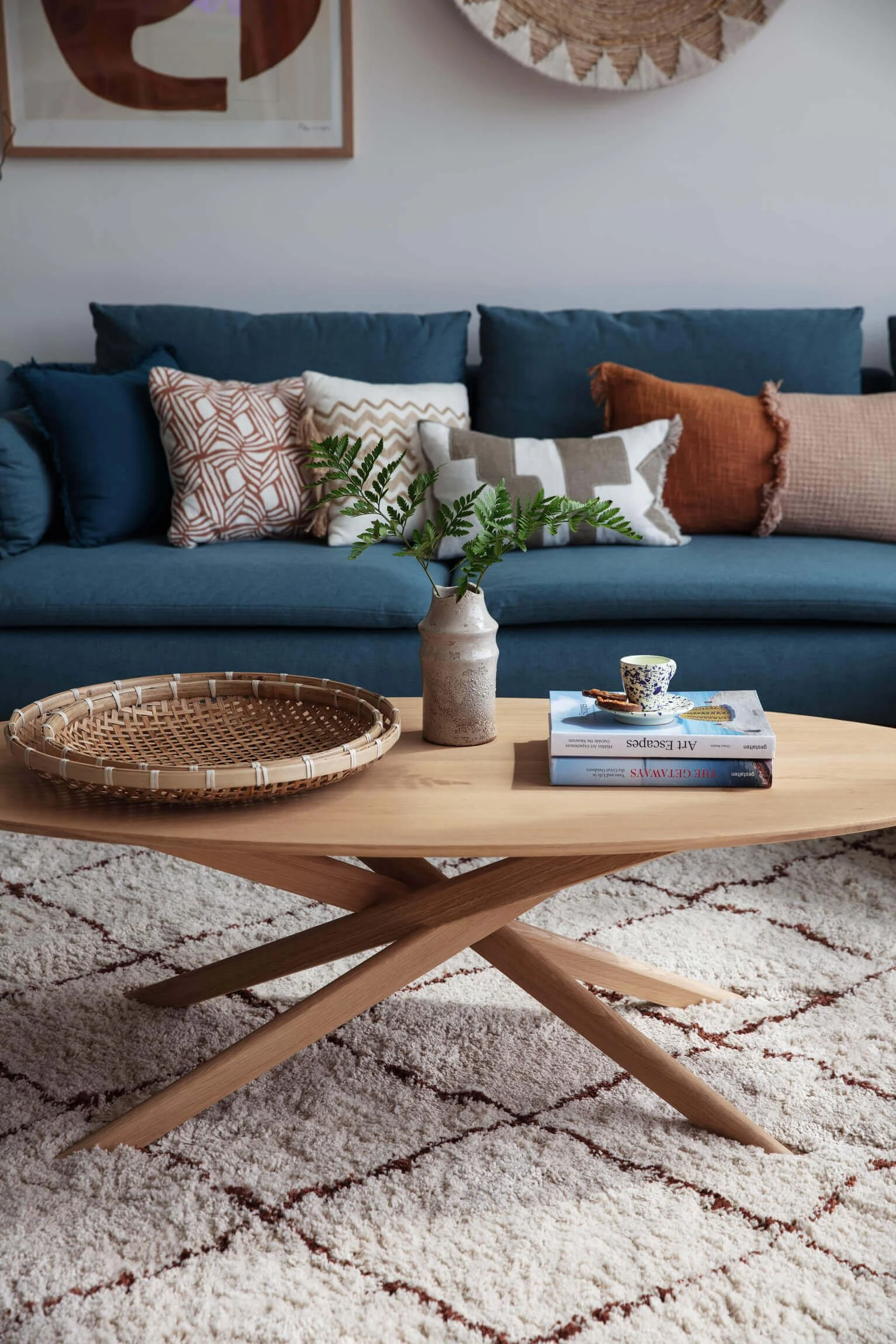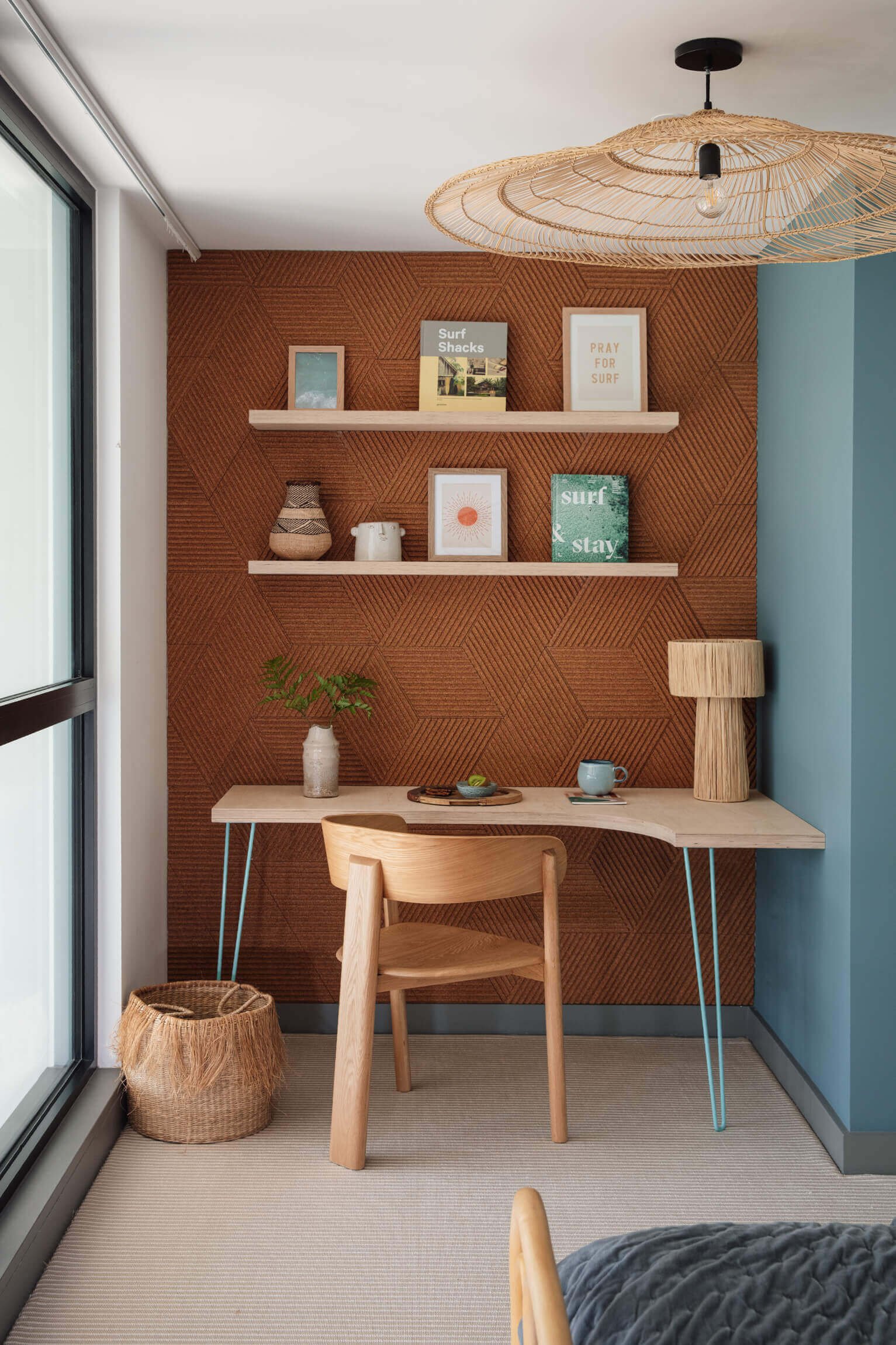 Famous for its surf, Croyde Bay inspired a boho-chic theme that incorporated ocean and earth colours and texture throughout. Unique macramé projects created by the owner were interspersed with rattan and wood to achieve an elegant beach shack feel, and bespoke 3D cork walls adorned several of the walls. The attention to detail was important, with accessories and furniture carefully chosen to create a point of difference from other beachside rentals. We intentionally kept the kitchen minimalist, but added a Bert & May geometric tiled splashback to tie in with the furnishings in the open plan living space, and hung statement wicker lampshades, chosen not only for their aesthetic but also for the unique shadow detail they created.